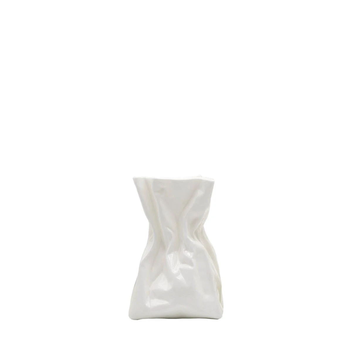 L’artista Xie Dong si è innamorata all’istante della speciale porcellana Bone China perché lo ritiene il materiale più adatto per la sua ispirazione in quanto è puro, delicato, liscio, sensibile e fragile. Lo smalto, simile alla pelle, fa apparire le linee più pure, riproduce le caratteristiche della carta e il cambiamento istantaneo delle linee con ricchi effetti visivi. Questi vasi sono la continuazione della serie Adelaide che Xie Dong ha realizzato per Driade originalmente in 2 dimensioni e forme diverse. Il vaso a forma di sacchetto di carta è ispirato ai sacchetti usati per il pane, nei quali le pieghe che si formano naturalmente sulla carta sono state solidificate nella porcellana. Il risultato dell’intero processo di conversione del materiale, è un’esperienza visiva leggera e senza peso. Il bianco è il colore più sensibile ai colori ambientali circostanti e alla luce, rafforza il ritmo delle pieghe e offre un senso di rilassamento e serenità.