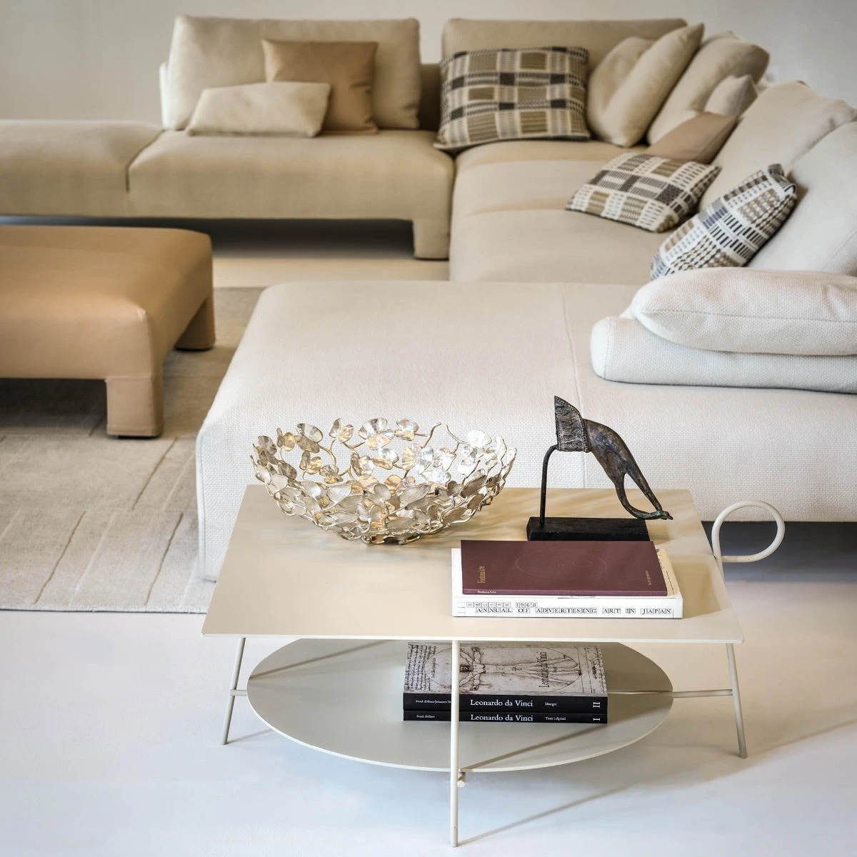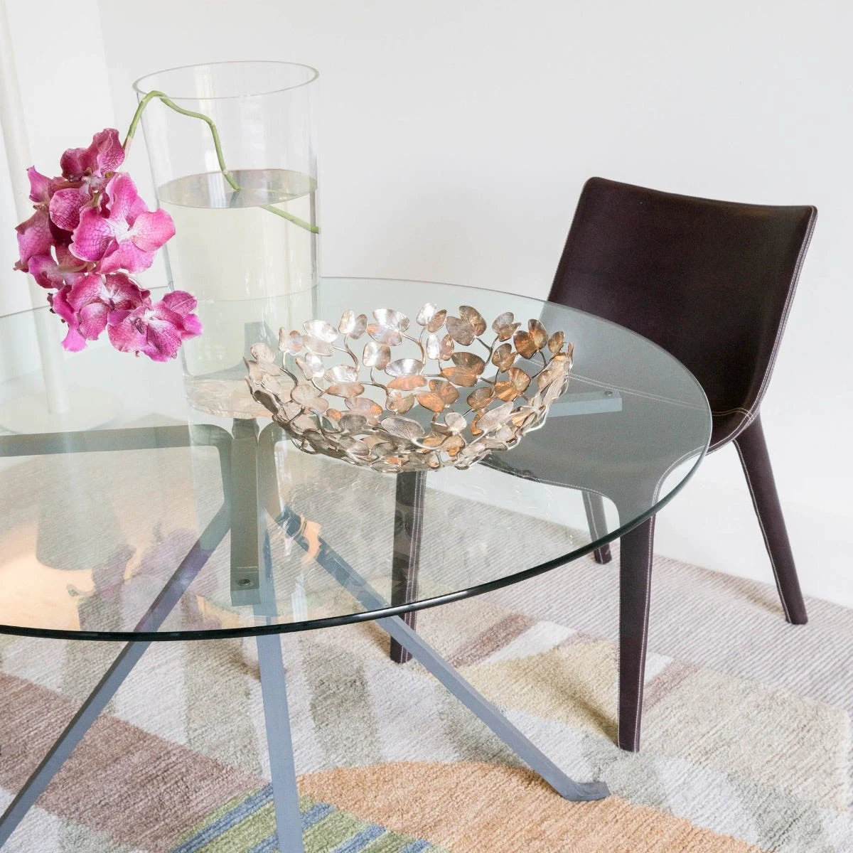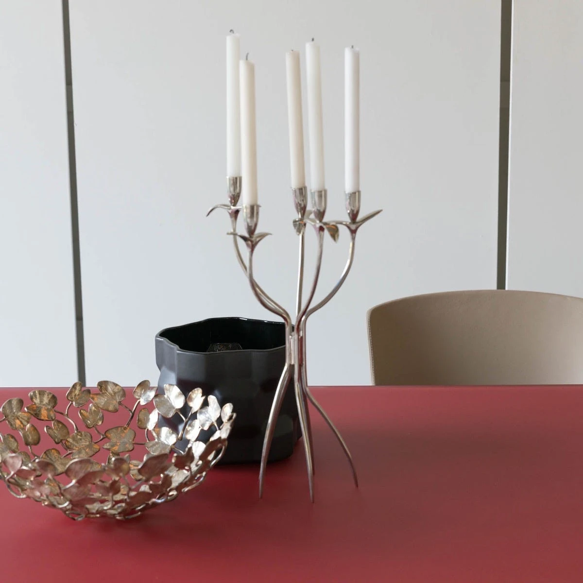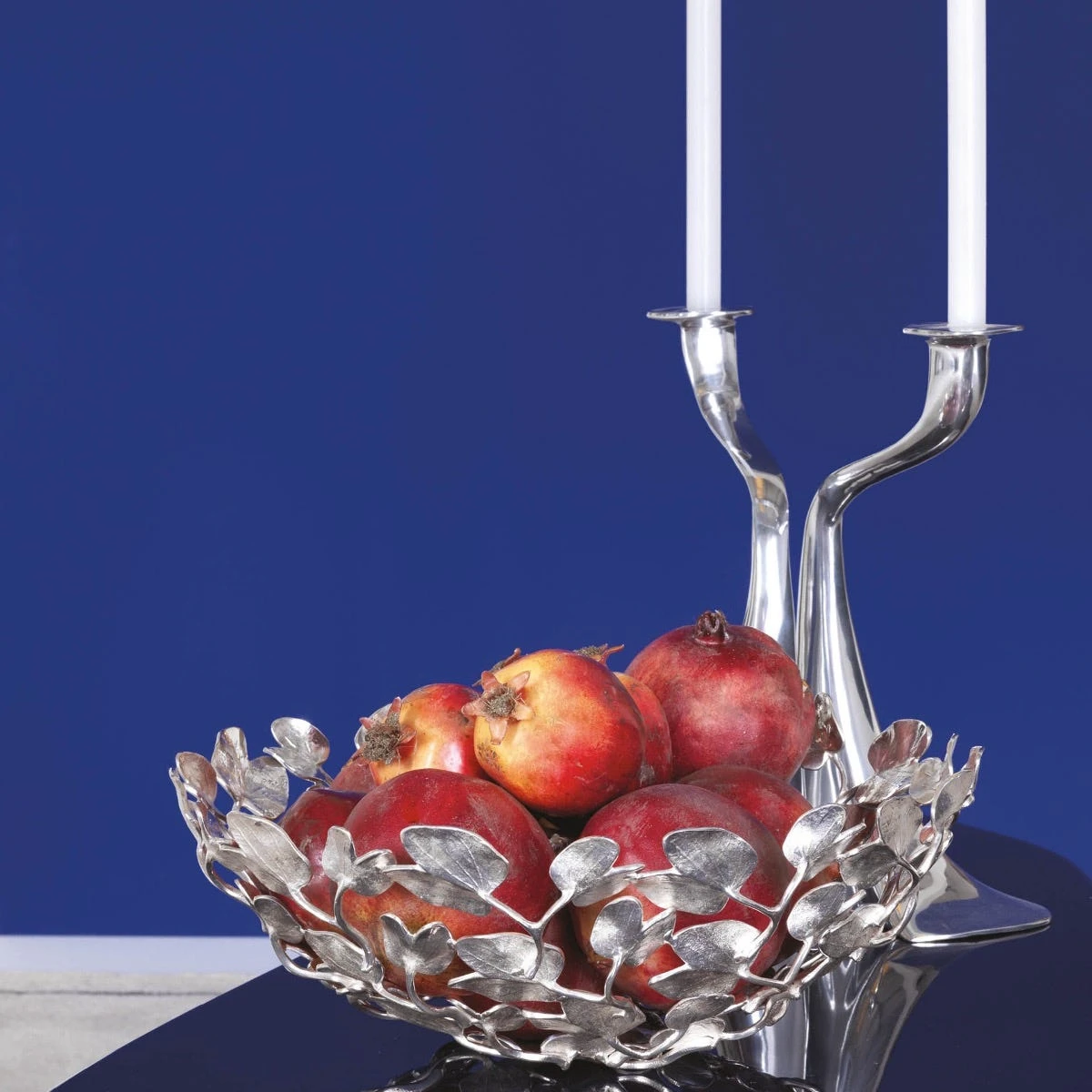 Un intreccio di fiori o foglie legate fra loro dai gambi e poi un groviglio ben ordinato di piccoli rami: sono centritavola preziosi, a forma di ciotola, questi creati da Mann Singh in ottone argentato.