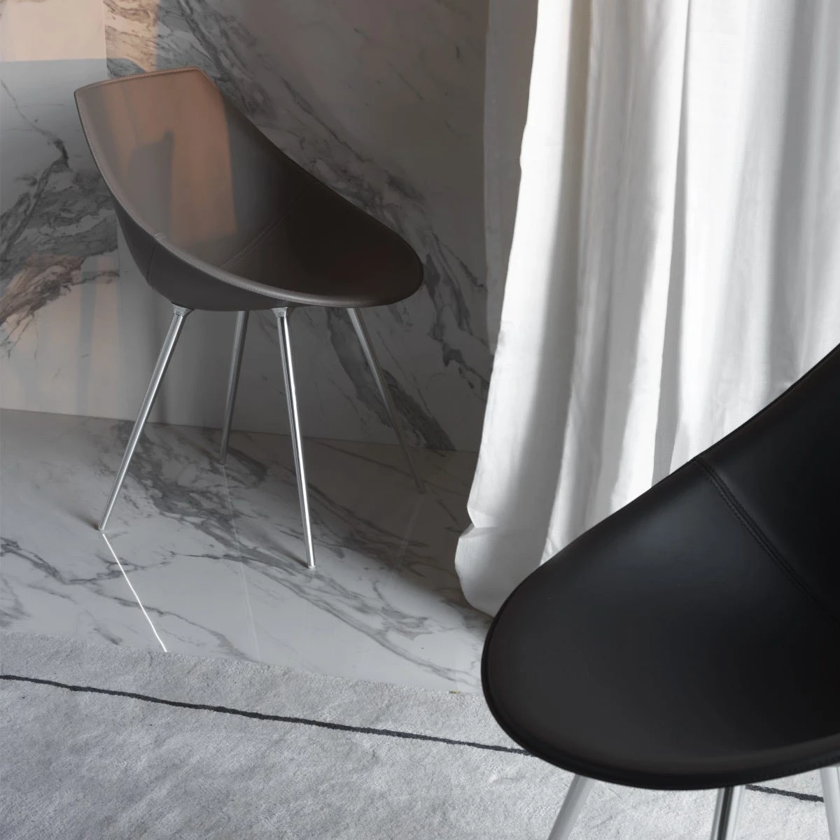 Caratterizzata dalla forma avvolgente della scocca e delle gambe a “spillo” Lagò viene esaltata dal colore assoluto e brillante che, volutamente, uniforma l’intera superficie, oppure è resa preziosamente materica dal rivestimento in cuoio.