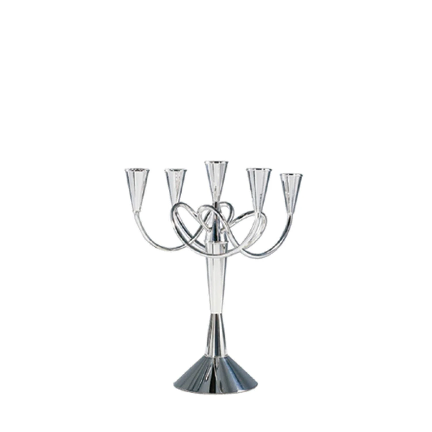 Declinato in due misure, un candelabro che Giuseppe Chigiotti ha voluto movimentato nei cinque bracci, tesi a definirsi nei coni portacandela.