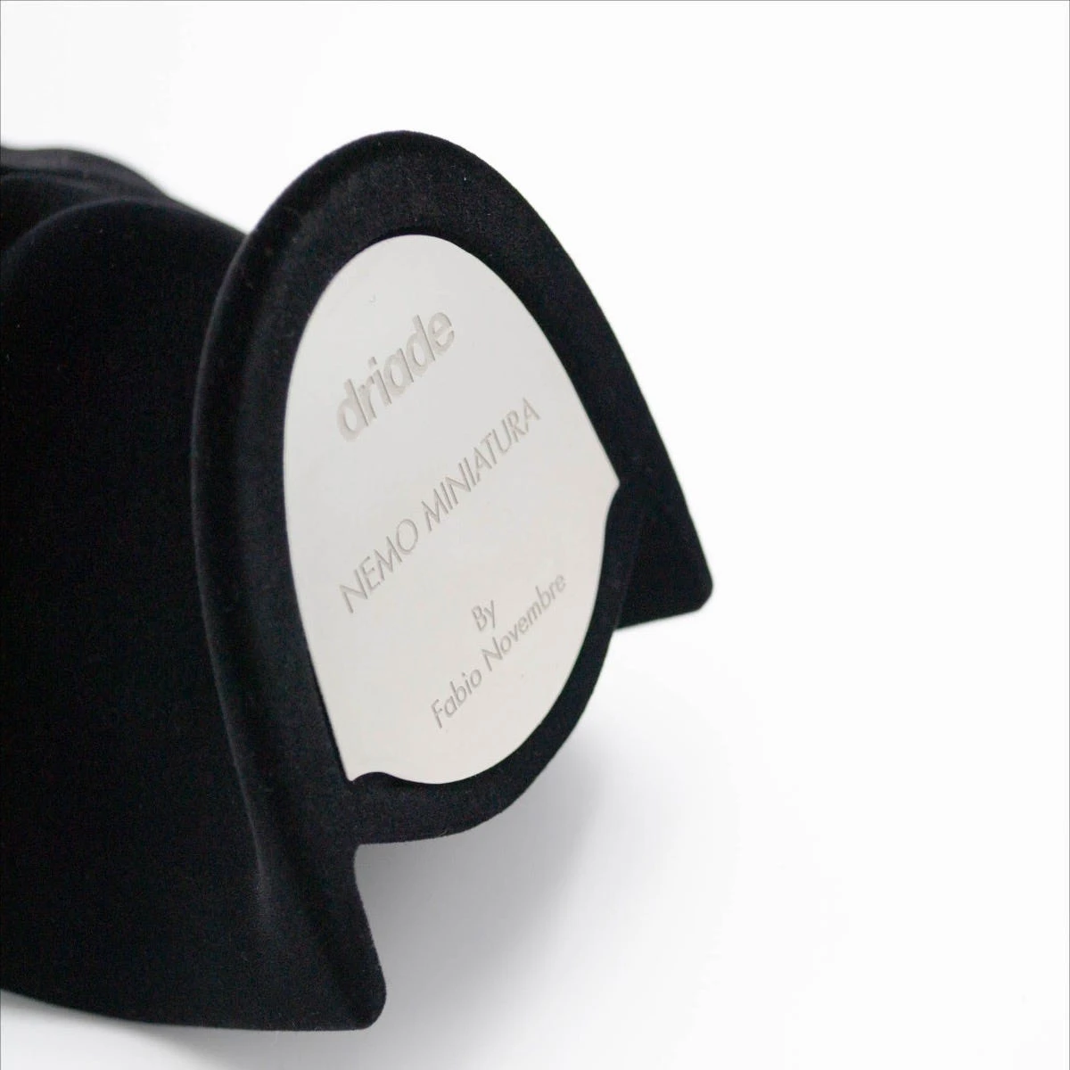 Nemo Miniatura velluto, è realizzata in ABS e successivamente impreziosita tramite un processo di floccatura. Al fondo è applicata a mano una targhetta in acciaio, che riporta logo, nome e designer, incisi a laser.
