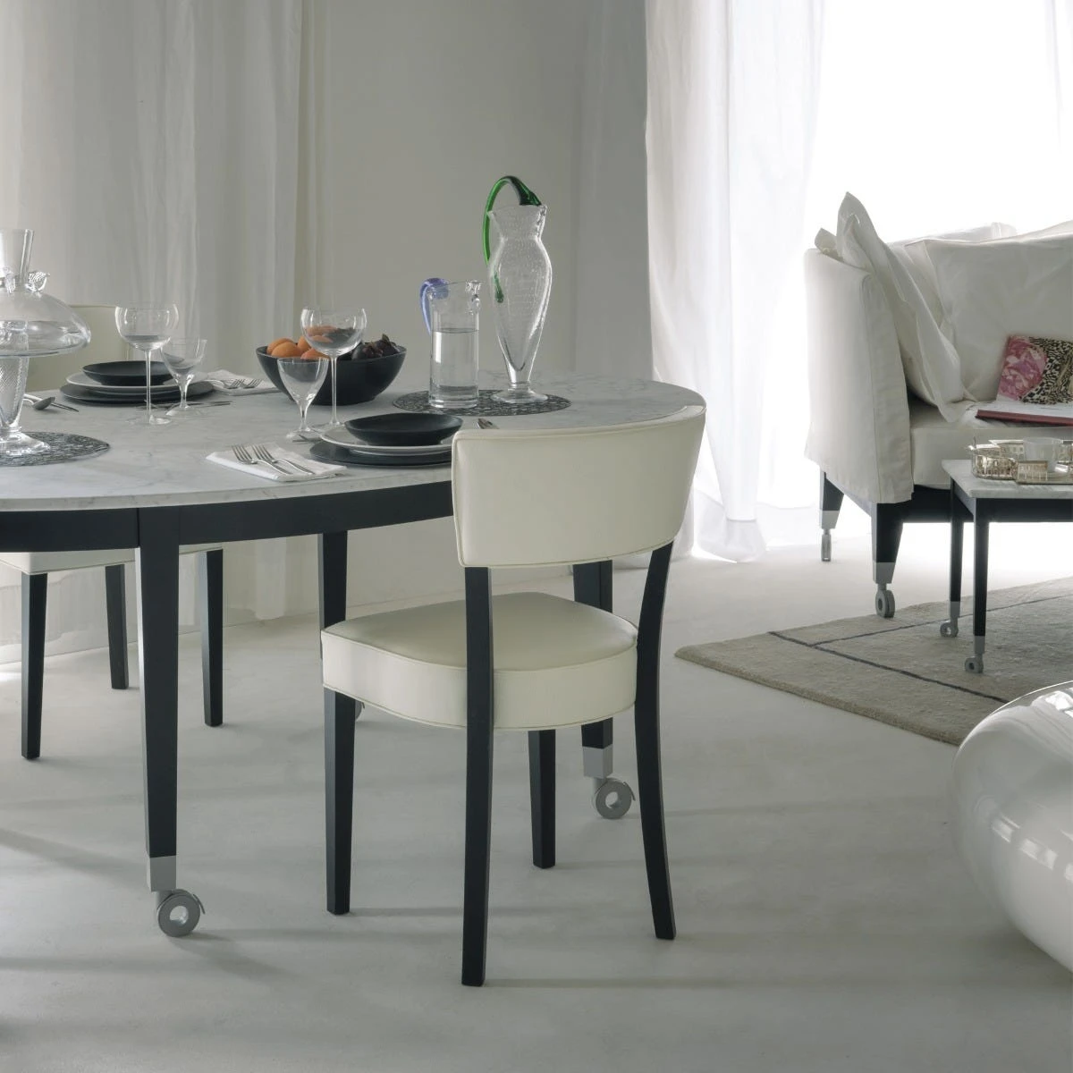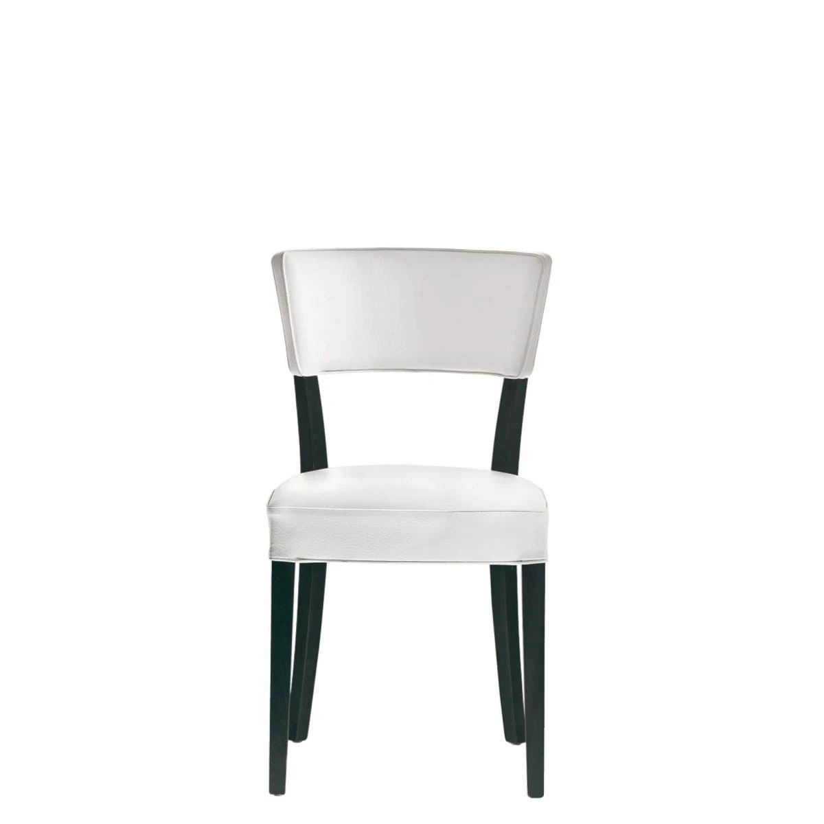 Sedia. Struttura in legno con finitura in faggio ebanizzato. Imbottitura in schiume poliuretaniche con rivestimento fisso in tessuto spalmato di colore bianco. Uso solo interno.