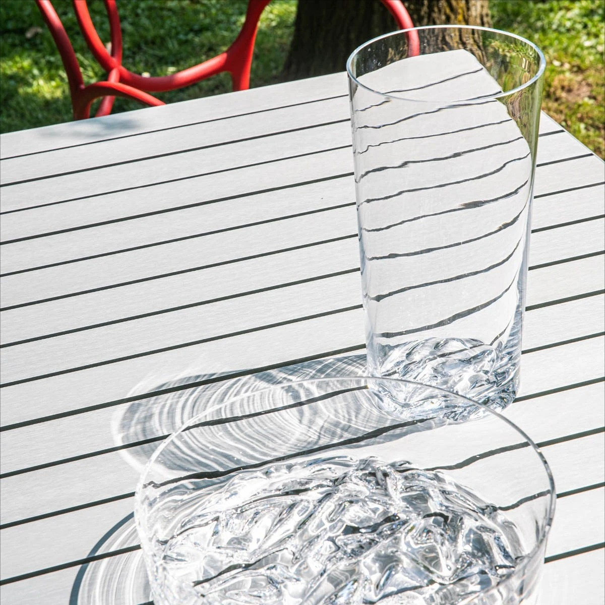 Trasparente il fusto, corrugato il fondo dei vasi in vetro e le coppe disegnate da Laudani & Romanelli, con effetto di acque agitate.