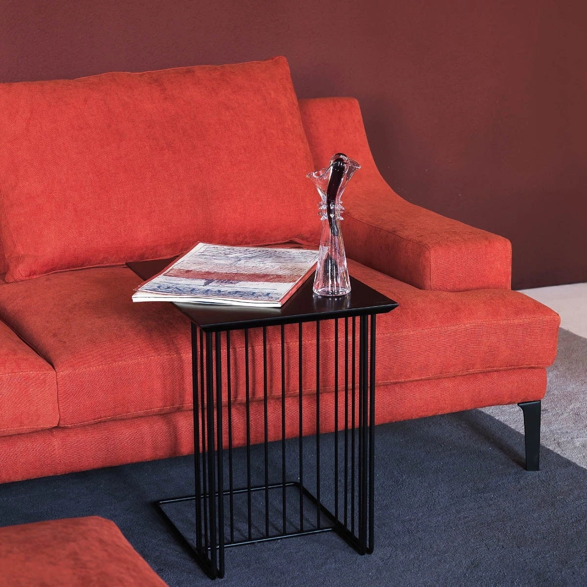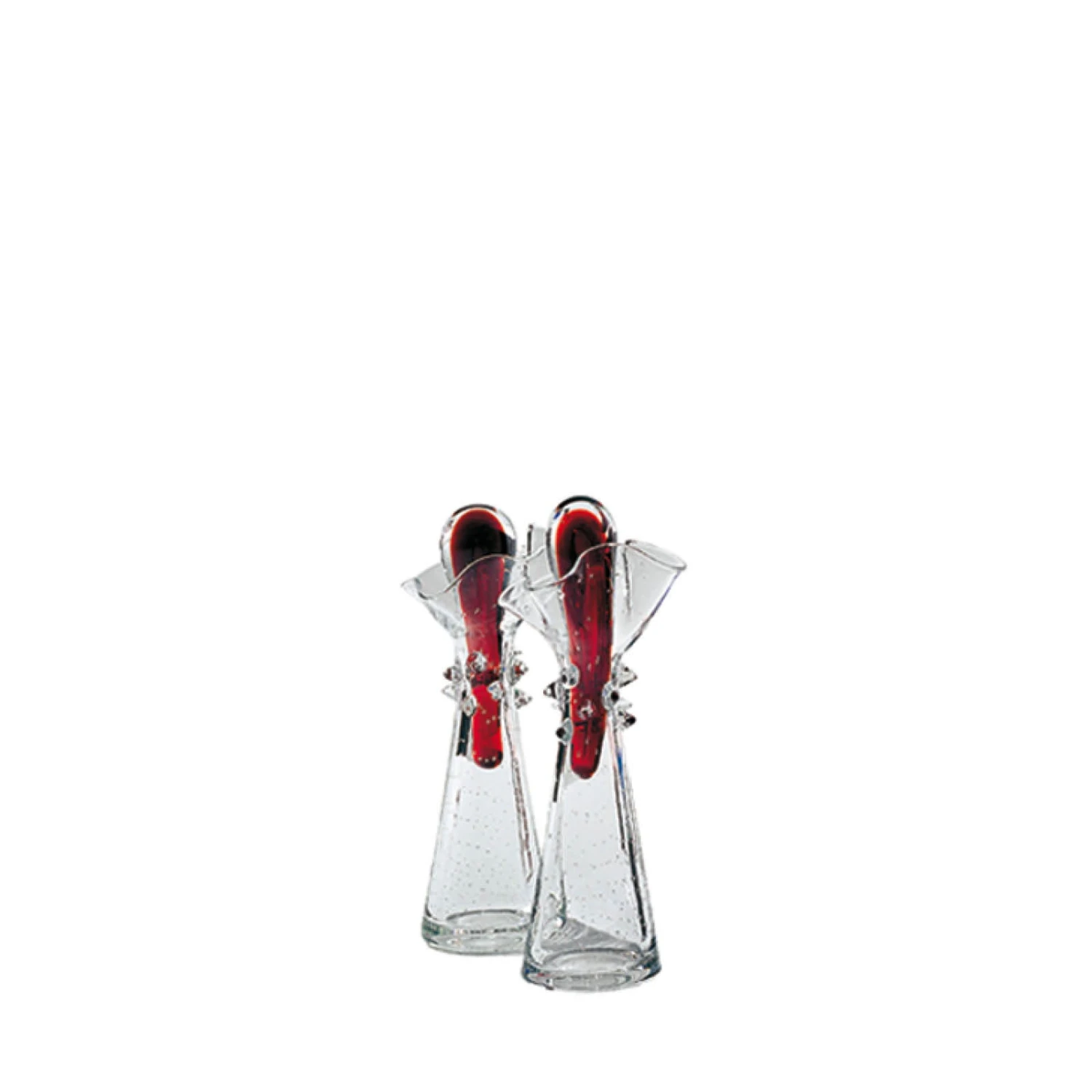 Il corpo delle ampolle è stretto da un nastro di frammenti vitrei e si dilata in alto a formare sinuose volute. Il tappo è una lunga goccia rosso fuoco. Borek sipek riesce nel suo intento: ammantare di ricchezza anche il più semplice degli oggetti di uso comune.