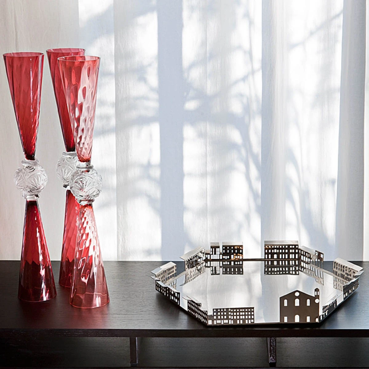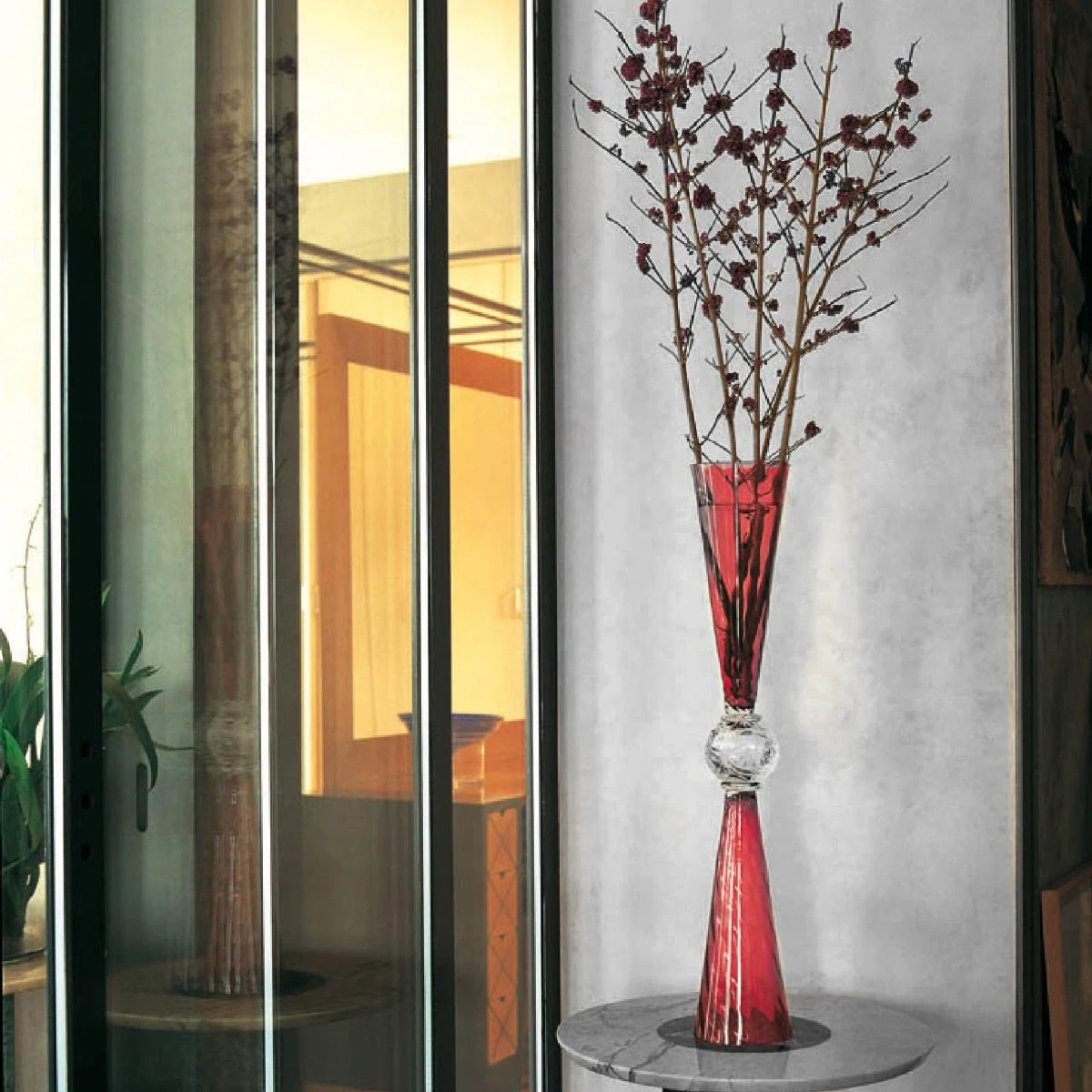 Vaso in vetro soffiato nei toni del rosso corallo, si caratterizza per la sua linearità e per la sua forma perfettamente simmetrica.