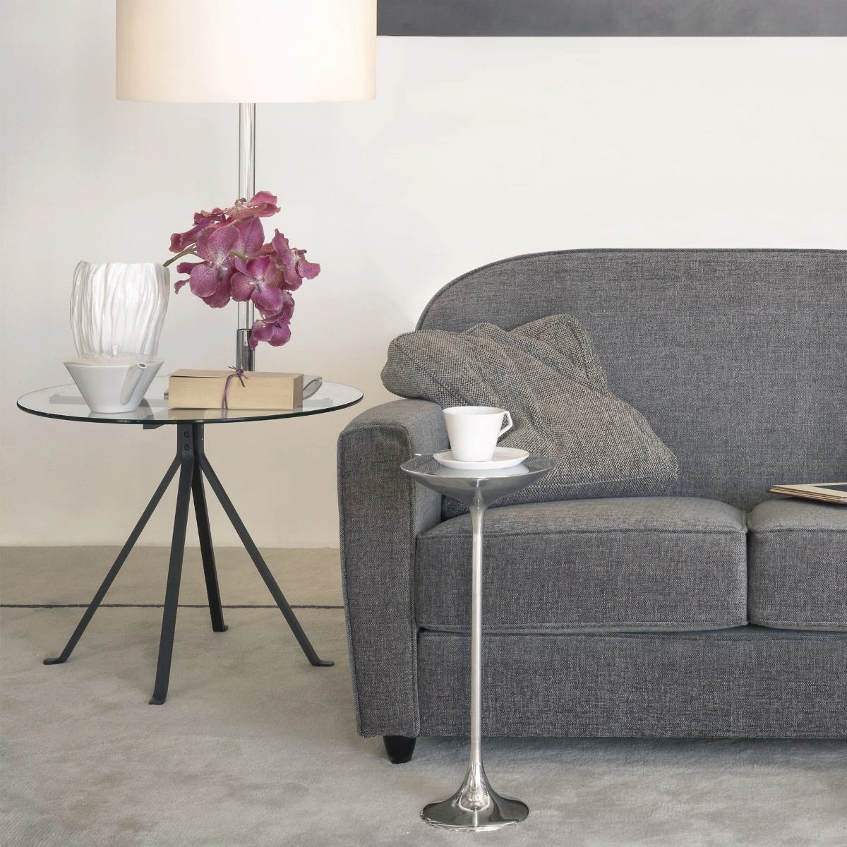 Esistevano un tempo, nelle case, piccoli oggetti servizievoli. Per il fumo piuttosto che per il cucito, per servire piuttosto che per esporre: essi punteggiavano gli spazi dell’abitare. Giuseppe Chigiotti, nell’ideare “Ping”, ripensa a quei periodi ormai trascorsi e tratteggia un servante declinato in due versioni: Ping I, caratterizzato dalla dimenticata funzione di svuota tasche, e Ping II, discreto piano d’appoggio per un bicchiere o un libro.