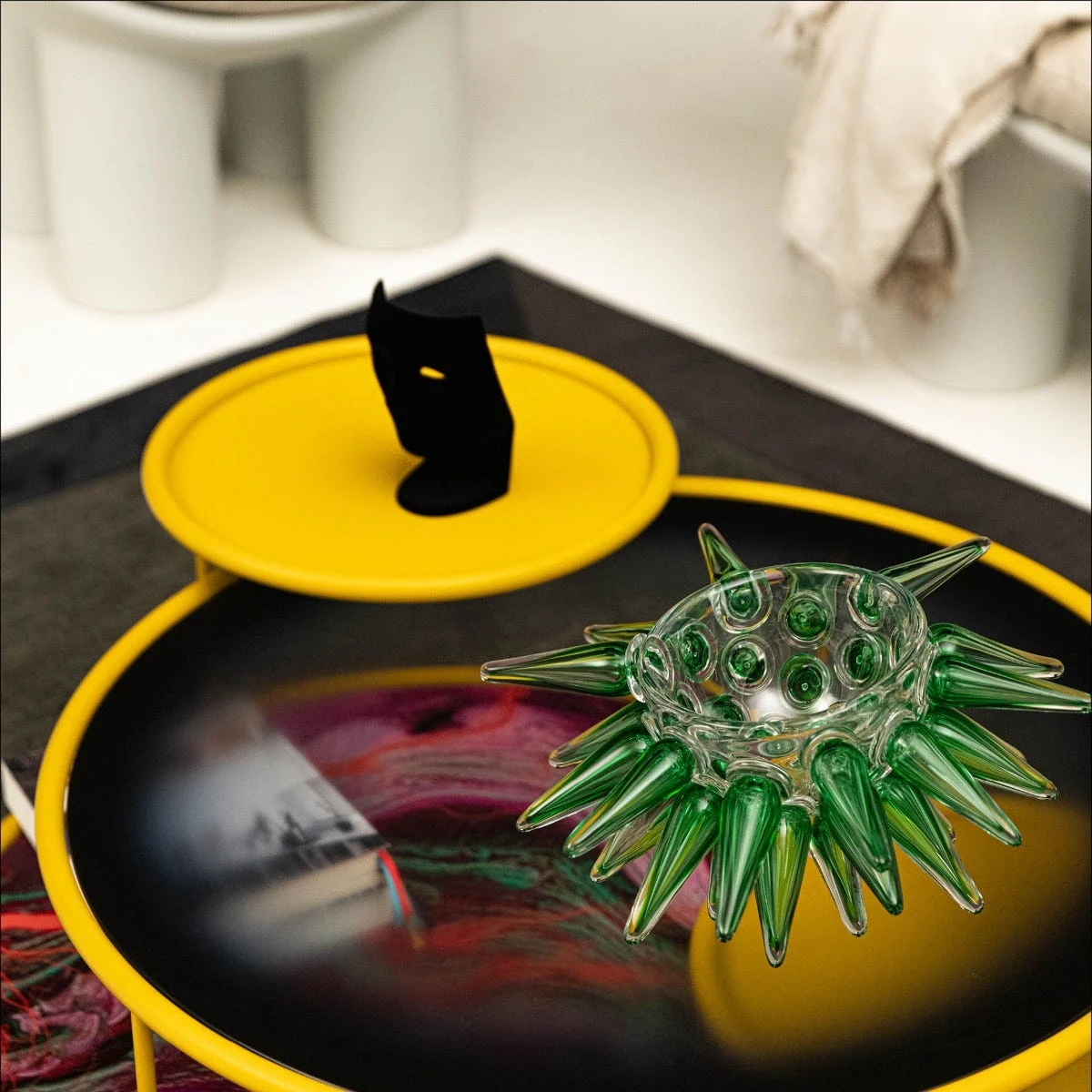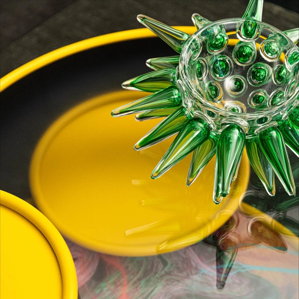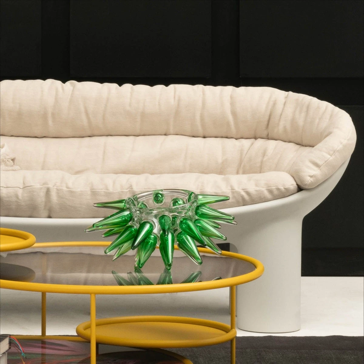 Iconica coppa centrotavola sorretta dalle verdi punte decorative. per una sensuale gioia degli occhi. Grazie a Borek Sipek.