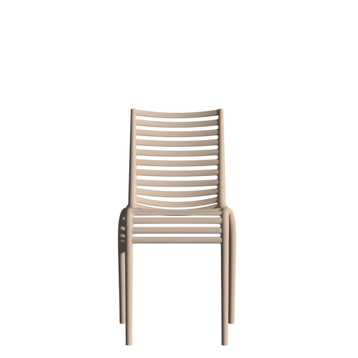 Sedia monoblocco impilabile in polipropilene di colore bianco (RAL 9001), grigio scuro (Pantone 446U), cipria (DIC C104) o grigio lavanda (DIC C285). Uso interno/esterno.
