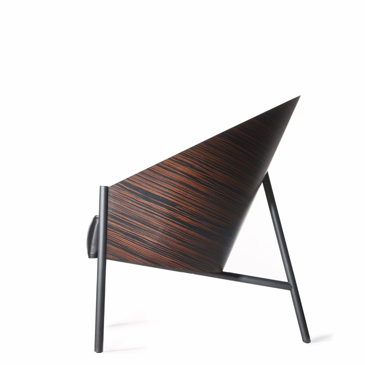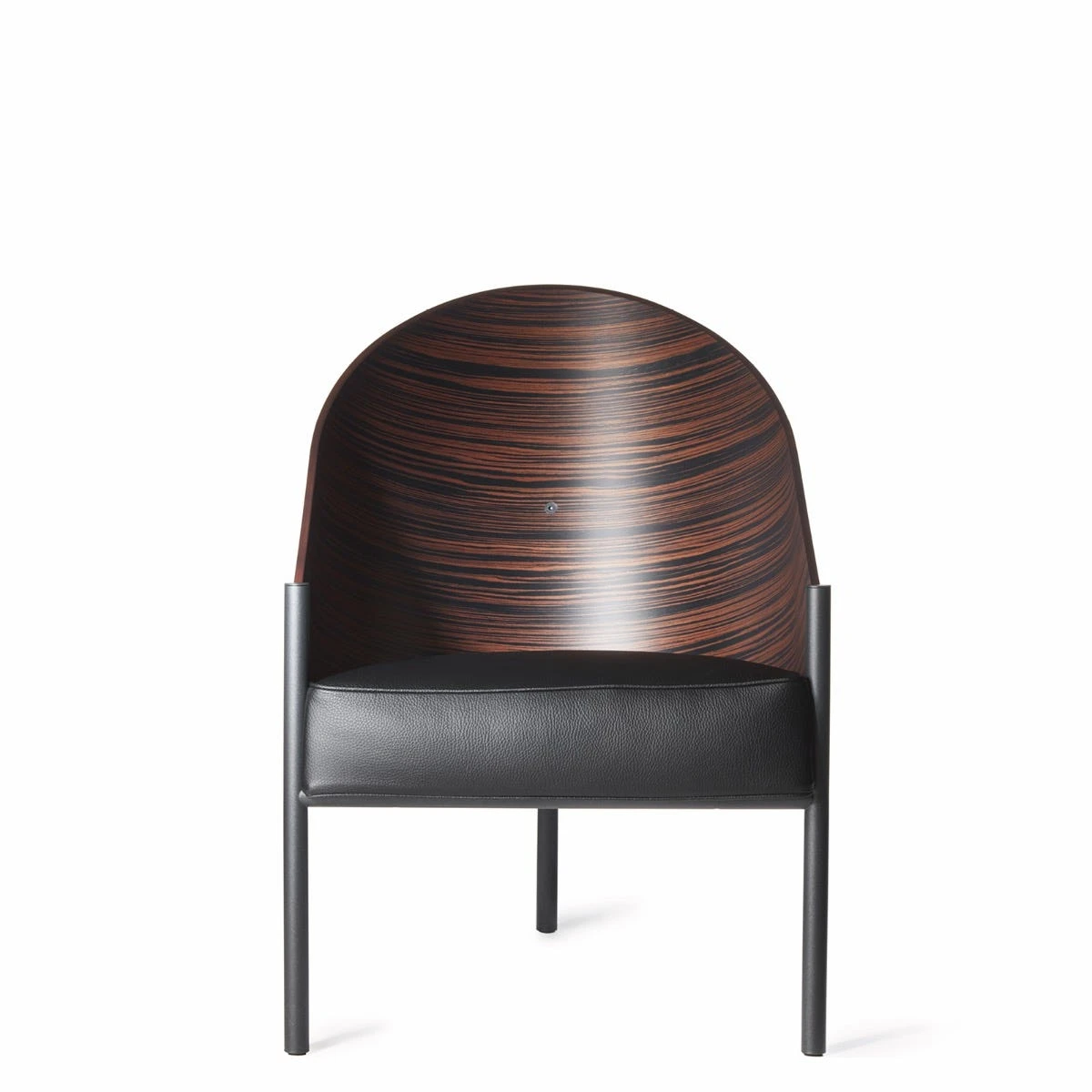 Poltrona con struttura in tubolare di acciaio verniciato a polvere poliestere nel colore grigio antracite micalizzato, scocca in multistrato curvato con finitura in ebano naturale. Cuscino di seduta con imbottitura in schiume poliuretaniche con densità differenziate rivestito in pelle di colore nero.
