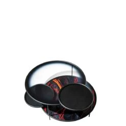 Sangaku è un divertente gioco di intersezioni, rotazioni e variazioni dimensionali. Nella cultura giapponese infatti i Sangaku sono dei problemi geometrici incisi su tavolette di legno, che nella maggior parte dei casi illustrano problemi riguardanti cerchi ed ellissi inscritti l’uno nell’altro. Da qui l’idea di inscrivere all’interno di una circonferenza immaginaria di raggio 50 cm quattro diverse circonferenze, due da 40 cm e due da 20 cm di raggio, creando un nuovo elemento regolato da rapporti geometrici invisibili ma comunque percettibili. I punti di intersezione tra i vari elementi diventano le gambe a sostegno dei quattro differenti piani, che riescono sapientemente a colmare e differenziare lo spazio creando un mix perfetto di pieni e vuoti.