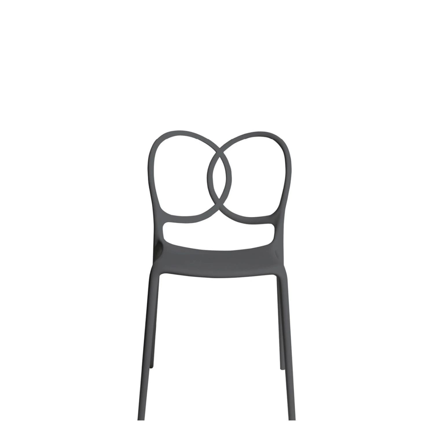 Sedia impilabile. Monoblocco in polipropilene copolimero con fibra vetro, piedini in polietilene semimorbido naturale di colore grigio scuro (Pantone 446U). Disponibile anche con il rivestimento di seduta. Uso interno/esterno.