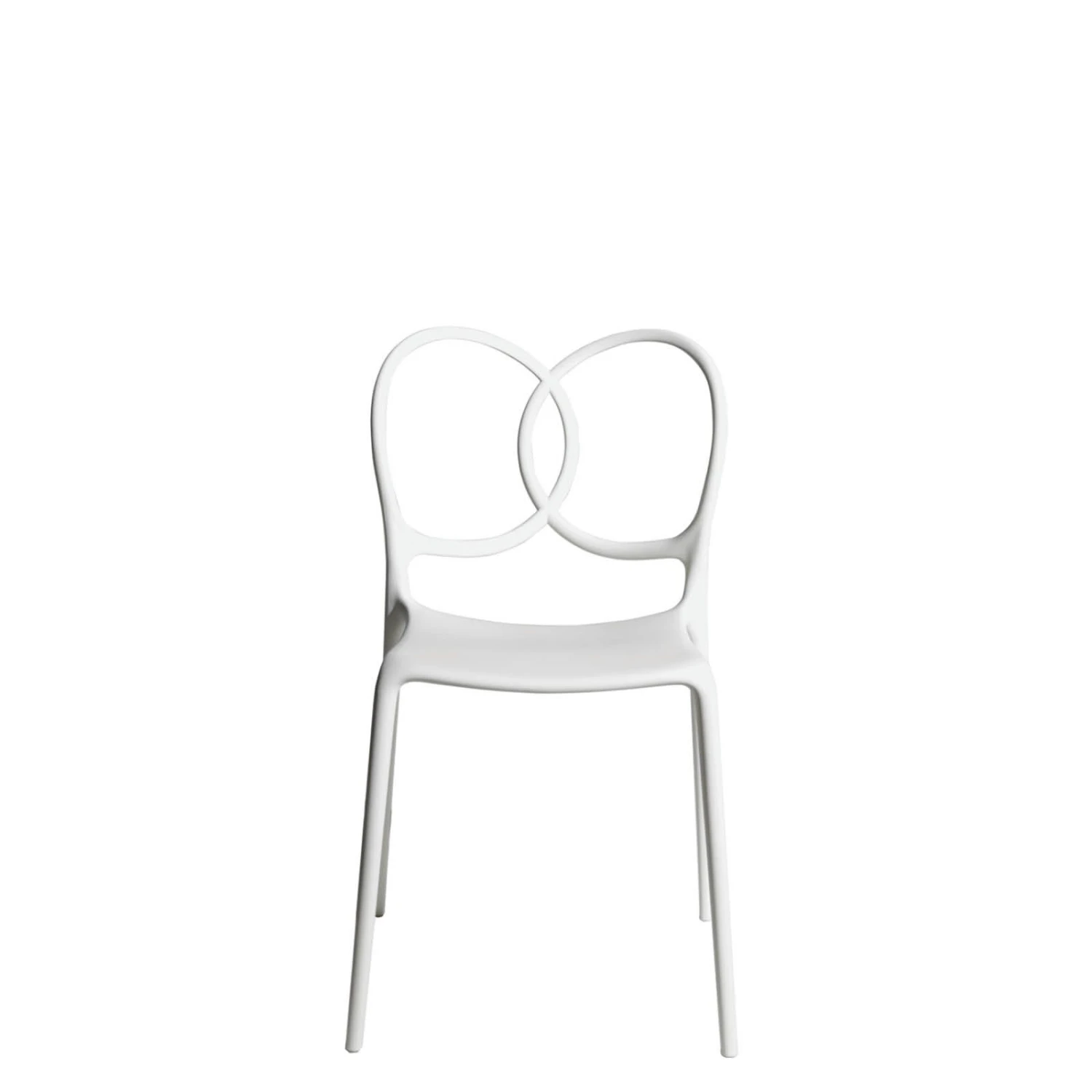 Sedia impilabile. Monoblocco in polipropilene copolimero con fibra vetro, piedini in polietilene semimorbido naturale di colore bianco (RAL 9001). Disponibile anche con il rivestimento di seduta. Uso interno/esterno.