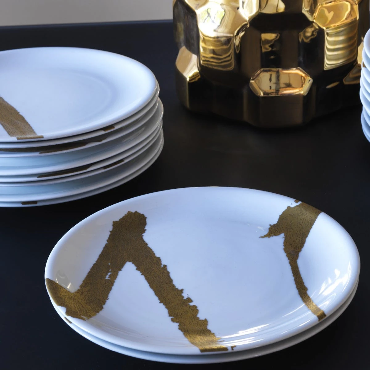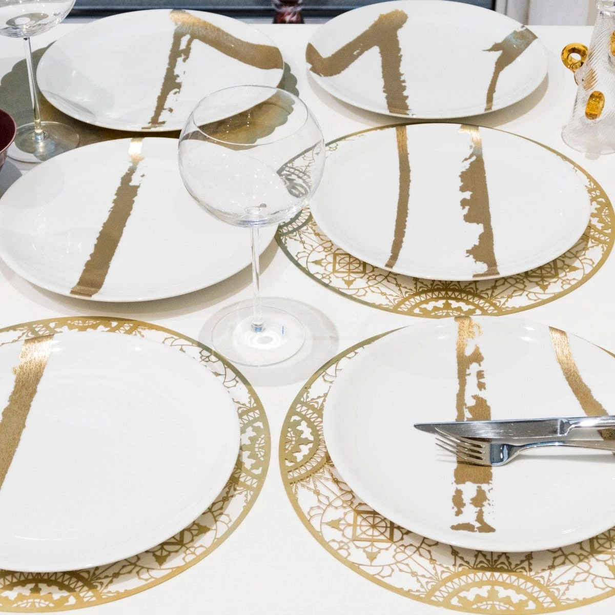 Il bianco si sposa con l’oro, grazie ai segni grafici dell’artista giandomenico sozzi, che attraversano con un gesto autorevole il candore dei piatti pensati da Antonia Astori.