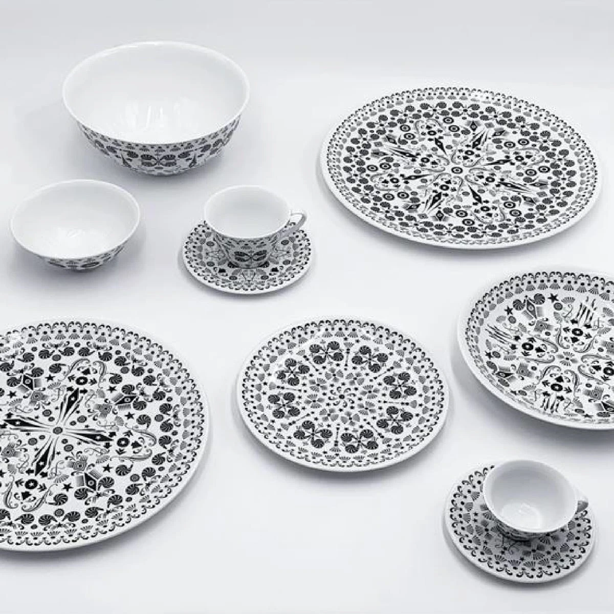 Straordinari decori firmati da Lorenzo Petrantoni arricchiscono l’iconica Collezione The White Snow. Per Driade, l’artista genovese attinge al repertorio grafico ottocentesco per un servizio di piatti che caratterizza con il proprio linguaggio espressivo. Petrantoni è artista, illustratore e art director poliedrico e spiazzante. Influenzato e affascinato dalle incisioni e della grafica del XVIII secolo, combina questi elementi nelle sue illustrazioni e nei suoi video. Le sue fonti d’ispirazione
