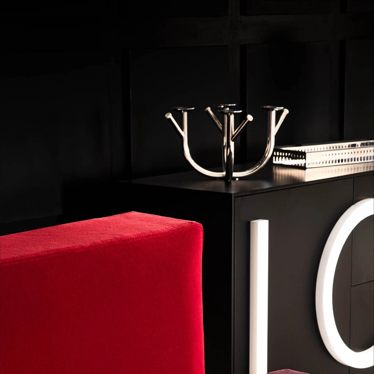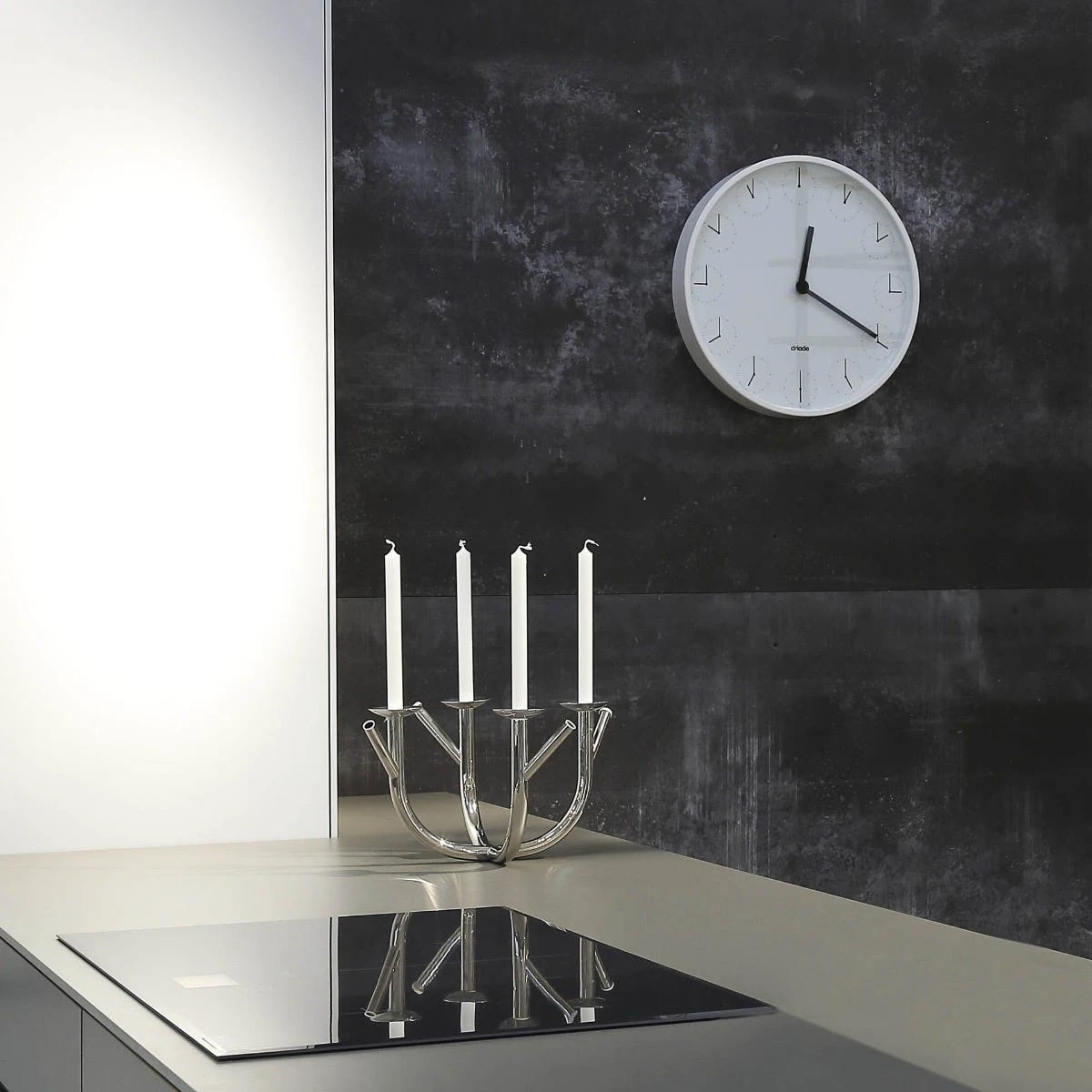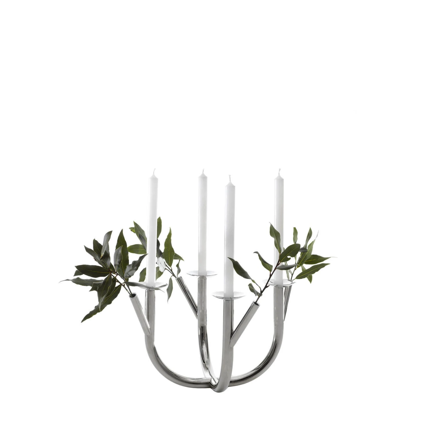 Quattro bracci uniti fra loro alla base, muniti di appendici cave per sistemarvi foglie o fiori. Un candelabro che è anche mini fioriera. Disegnato da Laudani & Romanelli.